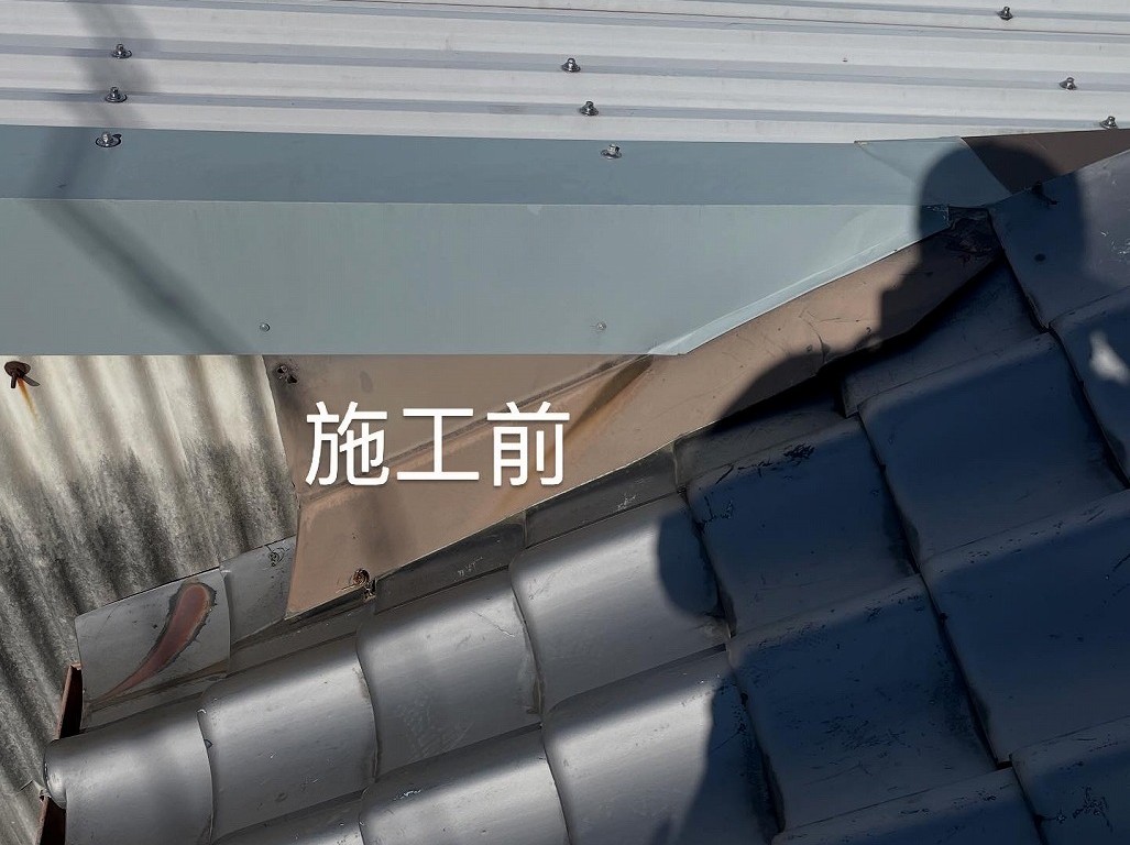 建物増築の際の接続部の隙間が開いており、風などが入ってくるのを何とか防げないかとご相談を受け、瓦、外壁とのすき間を塞ぐために板金を現地にて加工、取り付けをいたしました。以前からの付いている水切板金では瓦とのすき間が出来てしまっていましたが、追加で瓦1枚1枚の段差を埋める板金加工品を取り付け、すき間を塞ぐことができました。