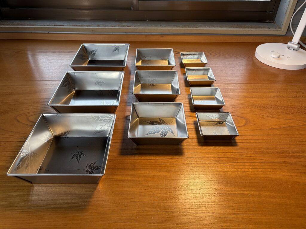 いきなり完成の写真ですが、1m×1mの材料からサイズ違いで10個のトレイを作れました。